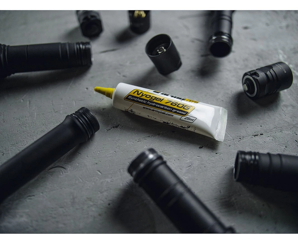 Podczas codziennego użytkowania latarki – przy zmianie trybów pracy, odkręcaniu lub zakręcaniu jej elementów – uszczelki pierścieniowe i gwinty narażone są na tarcie, które z czasem prowadzi do ich zużycia. Aby przedłużyć żywotność tych kluczowych części, stworzono specjalny smar techniczny Nyogel 760G, opracowany z myślą o maksymalnej ochronie i trwałości.
