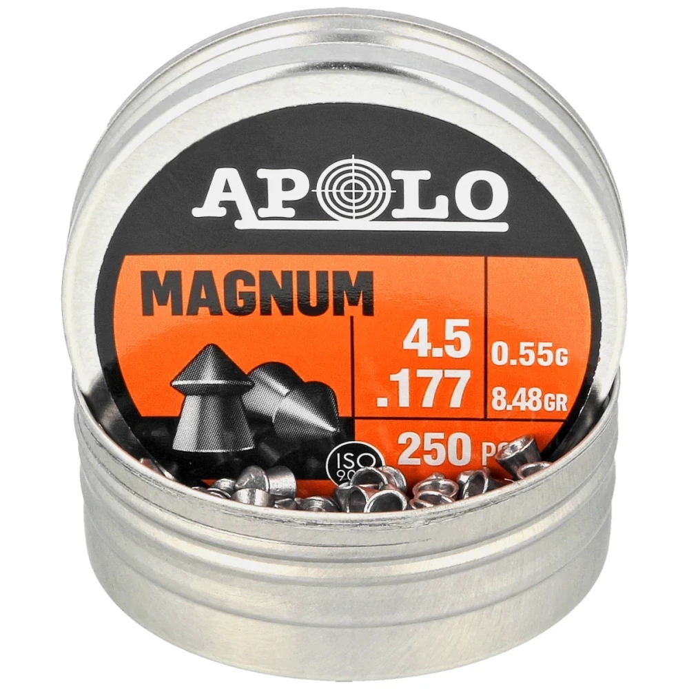 Magnum .177 ciężki śrut w kalibrze 4.5 mm o współczynniku balistycznym (Ballistic Coefficient) BC: 0.015. Ze względu na swoją masę charakteryzuje się silnym rozpłaszczeniem po trafieniu w cel oraz celnością - świetnym skupieniem. Łączy w sobie aerodynamikę śrutu Domed ze zdolnością penetracji śrutu Point. Amunicja klasy Premium argentyńskiej firmy Apolo w doskonałej cenie. Pakowane w zakręcane metalowe pudełko 250 szt. Bestseller!