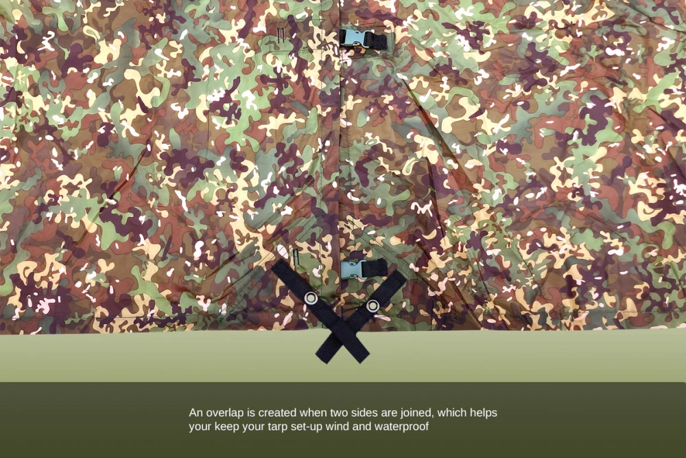 - NOWE klamry mocujące: Teraz z 18 mocnymi klamrami (9 klamr po 2 prostopadłych stronach plandeki). Pozwala to na tworzenie złożonych, zamkniętych konstrukcji, a nawet łączenie 2 lub więcej plandek razem* – idealne do biwakowania grupowego i większych schronień w niepogodę.
