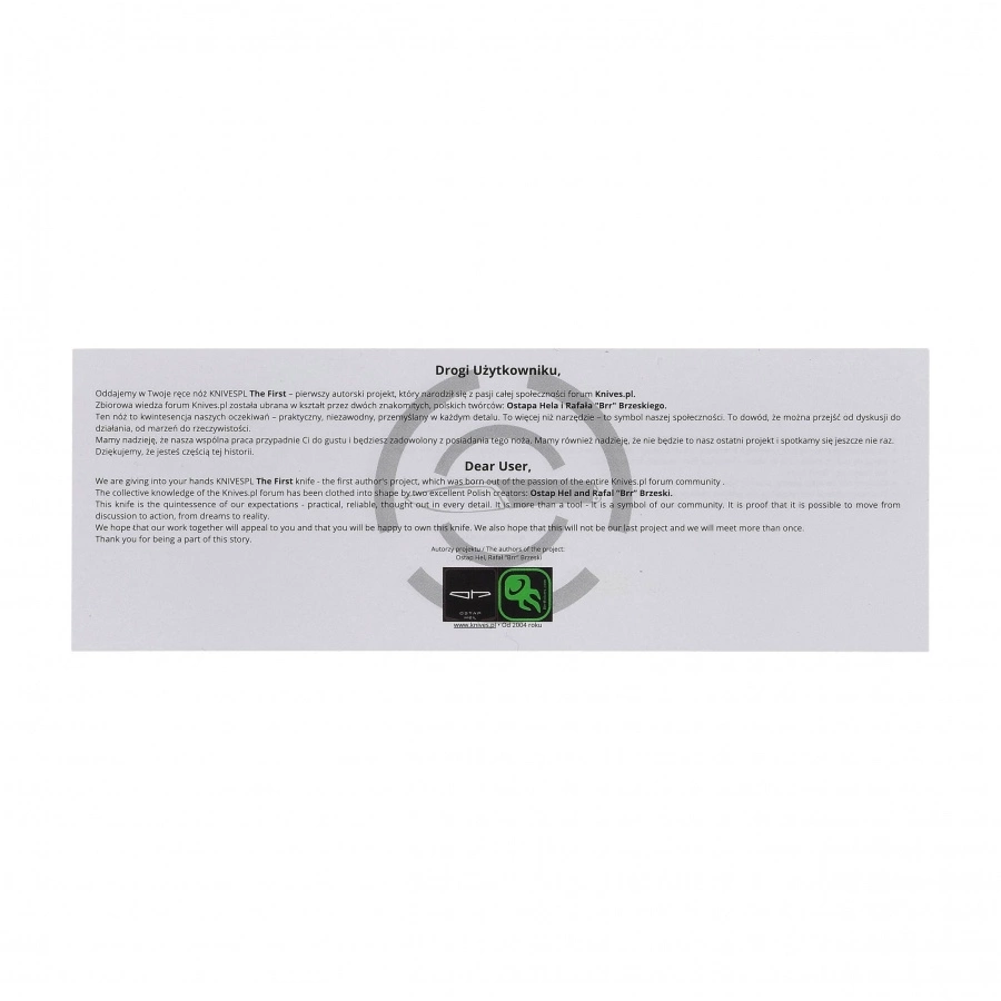 KNIVESPL The First to projekt, który powstał z autentycznej pasji społeczności KNIVESPL oraz kunsztu dwóch cenionych projektantów: Ostapa Hela i Rafała „Brrr” Brzeskiego. To nie jest zwykły nóż – to symbol wspólnoty, zaangażowania i miłości do rzemiosła. Każdy egzemplarz jest indywidualnie numerowany, dzięki czemu łączy w sobie charakter kolekcjonerski i pełną funkcjonalność noża EDC. The First to wyjątkowy folder zaprojektowany z myślą o osobach, które cenią precyzję, niezawodność i ponadczasowy styl.