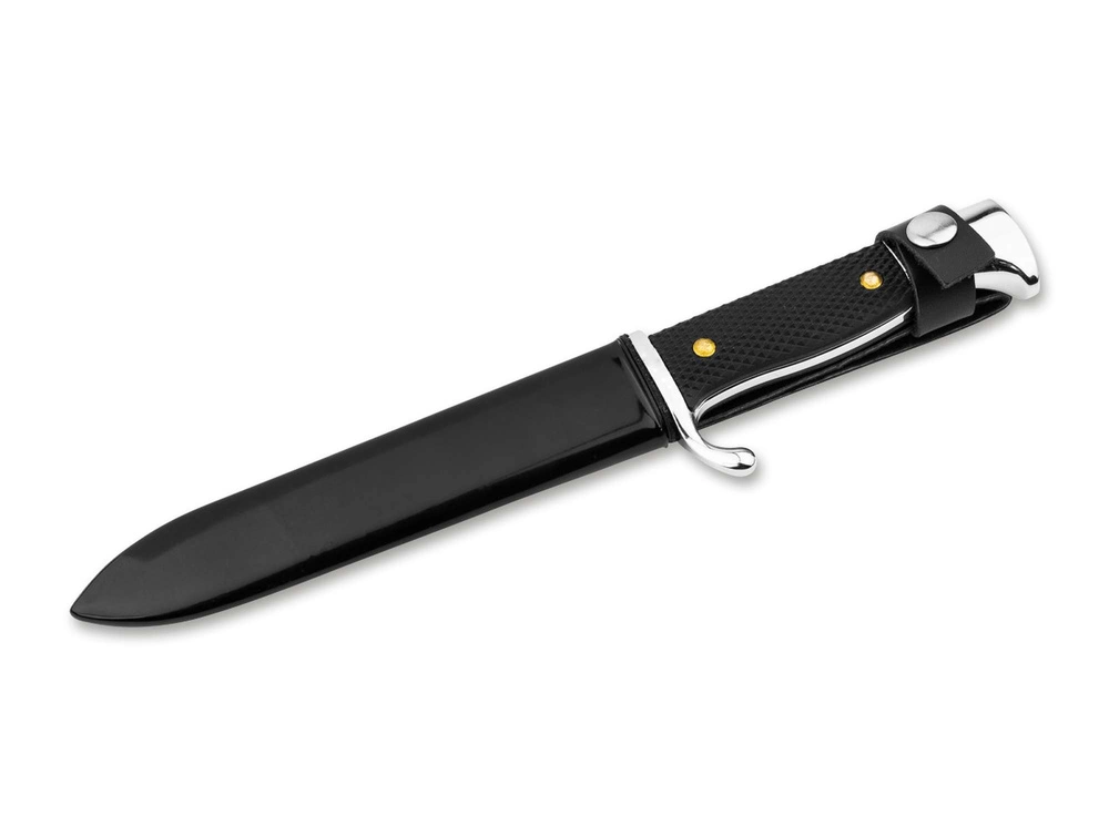 Profilowana rękojeść ze stalową głowicą pewnie leży w dłoni, a okładziny z wytrzymałego tworzywa o antypoślizgowej fakturze zapewniają stabilny chwyt także w wilgotnych warunkach. Stalowy, wygięty jelec dodatkowo chroni dłoń przed ześlizgnięciem na ostrze.
