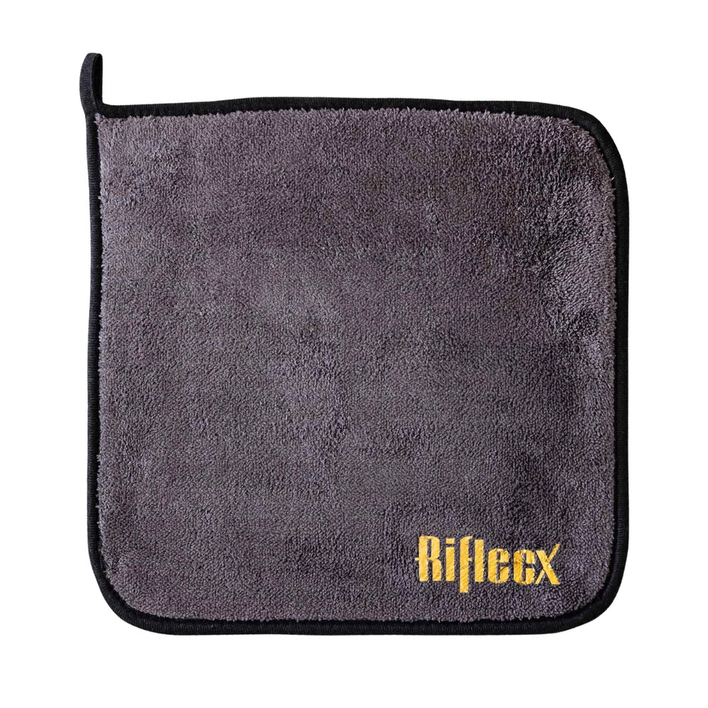 Ręcznik z mikrofibry do polerowania powierzchni na połysk po zastosowaniu płynu konserwującego od firmy RifleCX. Zastosowana mikrofibra jest mieszanką 80% poliestru i 20% poliamidu, cechującą się krótkim miękkim włosiem o dużej chłonności. Brzeg ścierki został obszyty czarną lamówką tworzącą gładką krawędź. Z tego samego materiału przyszyto w naróżniku ucho za które ręcznik można odwiesić na haczyk lub karabińczyk.