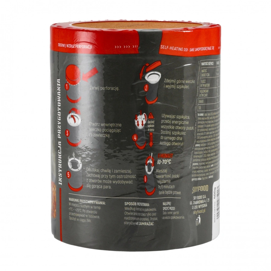 Niezawodny system podgrzewania działa w deszczu i na mrozie, a praktyczne dodatki pod plastikowym wieczkiem – sól, pieprz i wilgotna serwetka – pozwalają zjeść wygodnie w każdych warunkach. Sterylizacja bez konserwantów zapewnia bezpieczeństwo i długi termin przydatności, a kompaktowa puszka zmieści się w plecaku, skrzynce w aucie lub zestawie survivalowym.