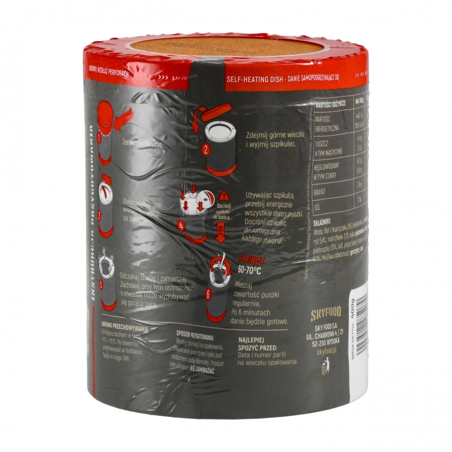 Gorący, domowy smak w samym środku szlaku – bez kuchenki, ognia czy prądu. Samopodgrzewający zestaw SKYFOOD w około 6 minut zapewnia pełnowartościowy posiłek, który przywraca energię i poprawia morale po długim marszu. Soczysty filet z kurczaka (29%) w aksamitnym sosie koperkowym z ryżem i warzywami tworzy sycącą, aromatyczną porcję idealną na biwak, długą trasę czy awaryjne sytuacje – bo w terenie liczy się coś więcej niż typowe przekąski turystyczne.