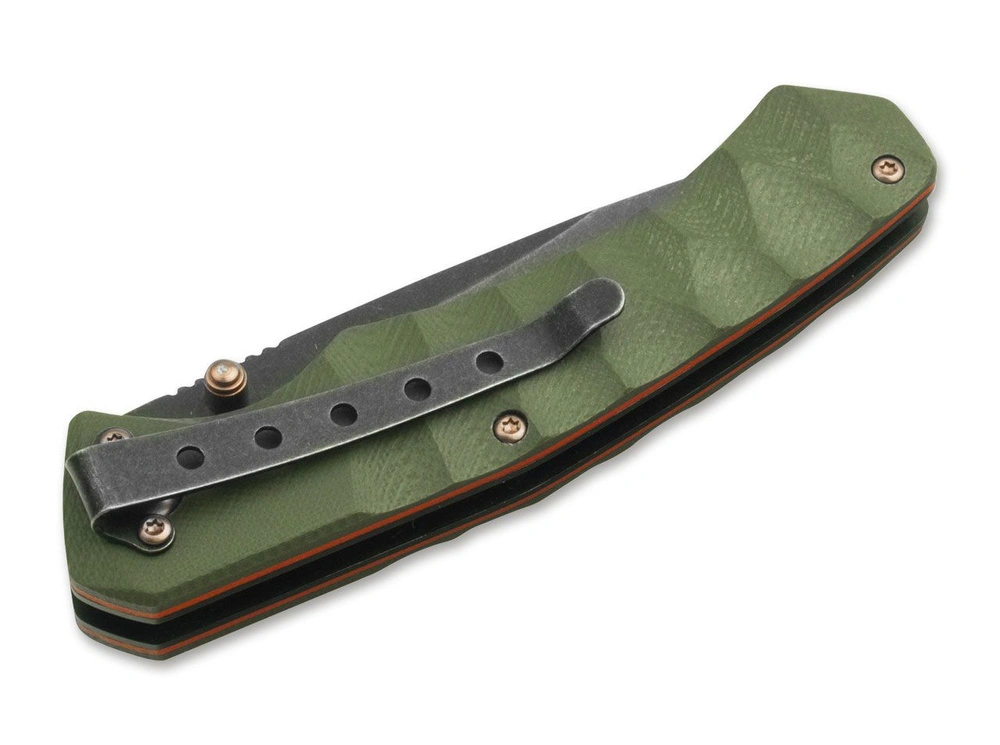 Ostrze wykonano ze stali nierdzewnej 440A w wykończeniu stonewash, co nadaje mu nowoczesny, matowy wygląd i zwiększa odporność na zarysowania. Rękojeść z G10 w kolorze oliwkowo-zielonym posiada antypoślizgową fakturę i trójwymiarowe frezowanie, dzięki czemu nóż pewnie leży w dłoni nawet w trudnych warunkach.