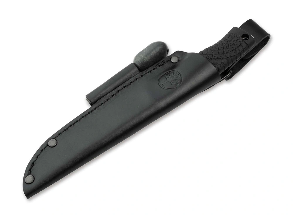 Nóż wyposażony jest w kołczanową, skórzaną pochwę - najwyższa dyscyplina w konstrukcji pochwy - zapewniająca głębokie i pewne dopasowanie noża. W ten sposób nóż jest chroniony w najlepszy możliwy sposób przed zgubieniem i uszkodzeniem podczas noszenia, bez konieczności stosowania podatnego na uszkodzenia zamka, który utrudnia szybki dostęp. Zdejmowana zawieszka pozwala na wysoką pozycję noszenia na pasku lub niską pozycję pod pasem biodrowym plecaka turystycznego. Dodatkowo nóż wyposażony jest w krzesiwo/metalową zapałkę o długości 9,3 cm od lidera rynku Light My Fire, która znajduje miejsce w szerokiej, obcisłej, skórzanej szlufce mocno wkomponowanej w lamówkę.