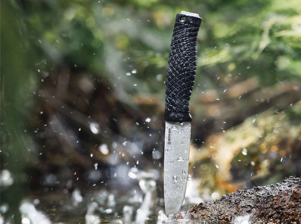 Projektując nasz nowy stały nóż outdoorowy Boker BRONCO postawiliśmy sobie ambitne cele. Powinien odpowiadać najnowocześniejszym możliwościom technicznym i oferować optymalną funkcjonalność w stosunku do współczesnych potrzeb. W tym celu powinien charakteryzować się następującymi cechami: - Uniwersalna i optymalna użyteczność dla wszystkich profesjonalnych użytkowników outdooru, takich jak bushcrafterzy, obozowicze, survivalowcy, wędrowcy, myśliwi, zespoły SAR i inni. - Ostrze wykonane ze stali CPM na najwyższym poziomie możliwości metalurgicznych - Rękojeść dobrze leżąca w dłoni nawet podczas długotrwałej pracy, całkowicie otacza trzpień na całej długości i nie odprowadza ciepła z zimnej dłoni - Wysoka wysokiej jakości skórzana pochwa, którą można nosić z zawieszką lub bez, i która chroni nóż przed zgubieniem i uszkodzeniem. I oczywiście 100% produkcja w Solingen/Niemcy - Umiarkowana cena w stosunku do sprzętu Udało nam się sprostać tym ambitnym wymaganiom w następujący sposób: CPM-3V został opracowany przez Crucible Industries LLC - specjalistę i światowego lidera rynku w stale proszkowe - zapewniające niespotykaną dotąd tolerancję na obciążenia udarowe, elastyczność na pękanie i odporność na odpryski przy fenomenalnym zachowaniu krawędzi i twardości 61±1 HRC. Takie właściwości proszkowej stali węglowej osiągnięto między innymi dzięki precyzyjnie dobranej zawartości chromu na poziomie 7,5%. W ten sposób można wykorzystać pozytywne właściwości pierwiastka stopowego Cr, takie jak wzrost odporności na zużycie i hartowność, przy jednoczesnym zachowaniu drobnej mikrostruktury. Uniwersalne szerokie ostrze drop-point z wysoko osadzonym szlifem szablastym zawsze było preferowanym kształtem myśliwych zarówno do polowania na dużą, jak i małą zwierzynę i nadaje się zarówno do drobnych zadań, takich jak wtapianie patyczkiem, jak i do bardziej zgrubnych, takich jak obowiązkowe pałkowanie . Trzpień jest ciągły i wystaje kilka milimetrów z końca rękojeści. Zapewnia to maksymalną stabilność, a trzpień wytrzymuje także silne uderzenia kłodą lub innym przedmiotem. Krótka część grzbietu ostrza tworzy ostre krawędzie pod kątem 90° po obu stronach, co umożliwia uderzanie opcjonalnie dostępną podpałką. Na materiał rękojeści wybrano TPE – elastomer termoplastyczny, który całkowicie otacza trzpień i posiada strukturę zapewniającą dobry chwyt w każdym kierunku obciążenia. TPE jest odporny, elastyczny, antypoślizgowy i ma niską przewodność cieplną. Dzięki temu nóż pewnie leży w dłoni w każdych warunkach pogodowych i roboczych oraz nie wysysa siły z palców w mokrych i zimnych warunkach. W porównaniu do konwencjonalnych elastomerów, TPE ma również tę zaletę, że zmniejsza obciążenie środowiska podczas produkcji, ponieważ odbywa się ona wyłącznie fizycznie i nie jest konieczna długotrwała i energochłonna wulkanizacja chemicznie usieciowanych elastomerów. Nóż wyposażony jest w kołczanową, skórzaną pochwę - najwyższa dyscyplina w konstrukcji pochwy - zapewniająca głębokie i pewne dopasowanie noża. W ten sposób nóż jest chroniony w najlepszy możliwy sposób przed zgubieniem i uszkodzeniem podczas noszenia, bez konieczności stosowania podatnego na uszkodzenia zamka, który utrudnia szybki dostęp. Zdejmowany dynda pozwala na wysoką pozycję noszenia na pasku lub niską pozycję pod pasem biodrowym plecaka turystycznego. To sprawia, że Boker BRONCO jest kompaktowym, wszechstronnym i niezbędnym narzędziem do przetrwania w dziczy i w każdej sytuacji.