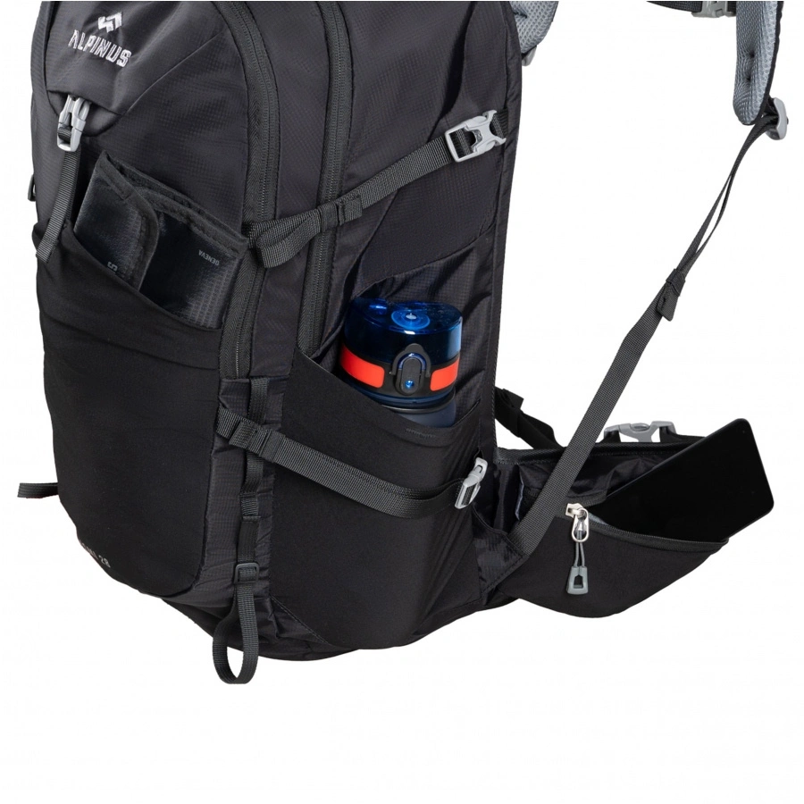Alpinus Mismi 28 został zaprojektowany z myślą o wygodnej organizacji ekwipunku. Otwór w górnej części plecaka i szlufki w szelkach ułatwiają prowadzenie rurki bukłaka, a wentylowana kieszeń frontowa sprawdza się do przechowywania wilgotnych ubrań. Boczne kieszenie i paski kompresyjne pomagają kontrolować objętość plecaka i szybko sięgać po najpotrzebniejsze rzeczy.