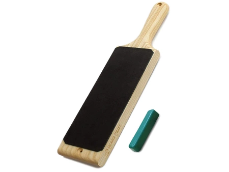 BeaverCraft Dual-Sided Leather Paddle Strop with P1 Polishing Compound to ręcznie wykonany duży, dwustronny skórzany pas na desce z drewna jesionowego. Do pasa dołączony jest środek polerski, który przyśpiesz ostrzenie narzędzi.