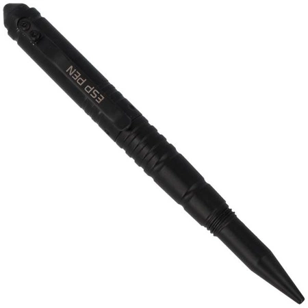 KBT-03-B lekki, kompaktowy długopis taktyczny firmy ESP w kolorze czarnym ze zbijakiem do bicia szyb. Ukryty wewnątrz gumowej stożkowej głowicy twardy kolec/zbijak do bicia szyb wykonano z węglika wolframu.