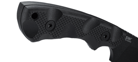 Do wytworzenia rękojeści użyto G10, lekki i wytrzymały materiał zwiększa kontrolę nad nożem i umacnia chwyt, dodatkowo na zakończeniu znajduje się otwór na linkę.